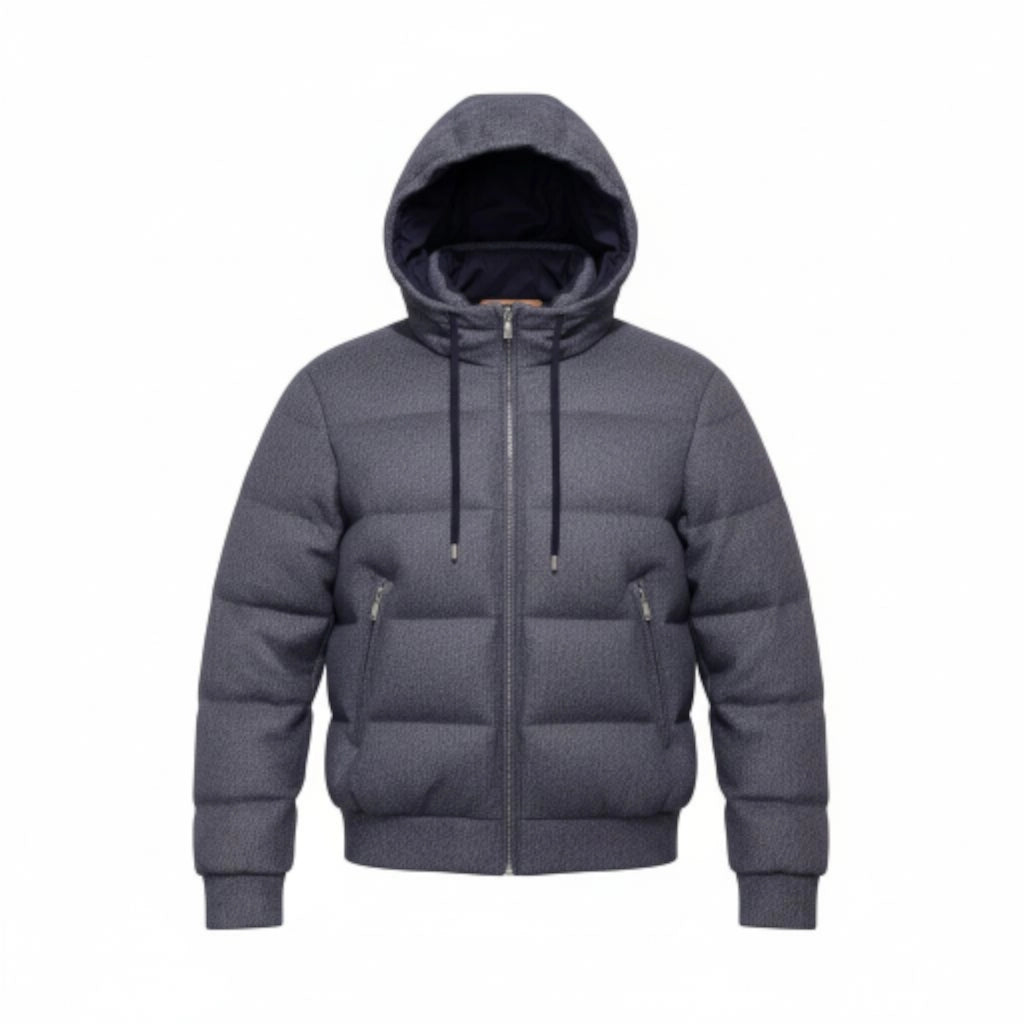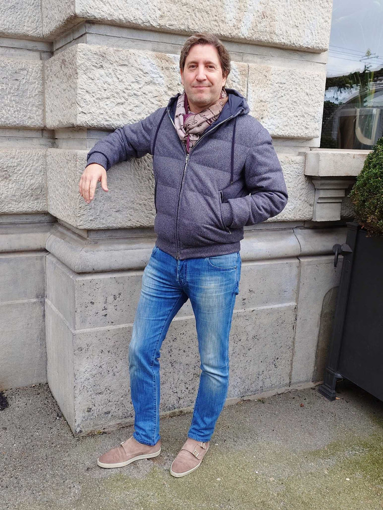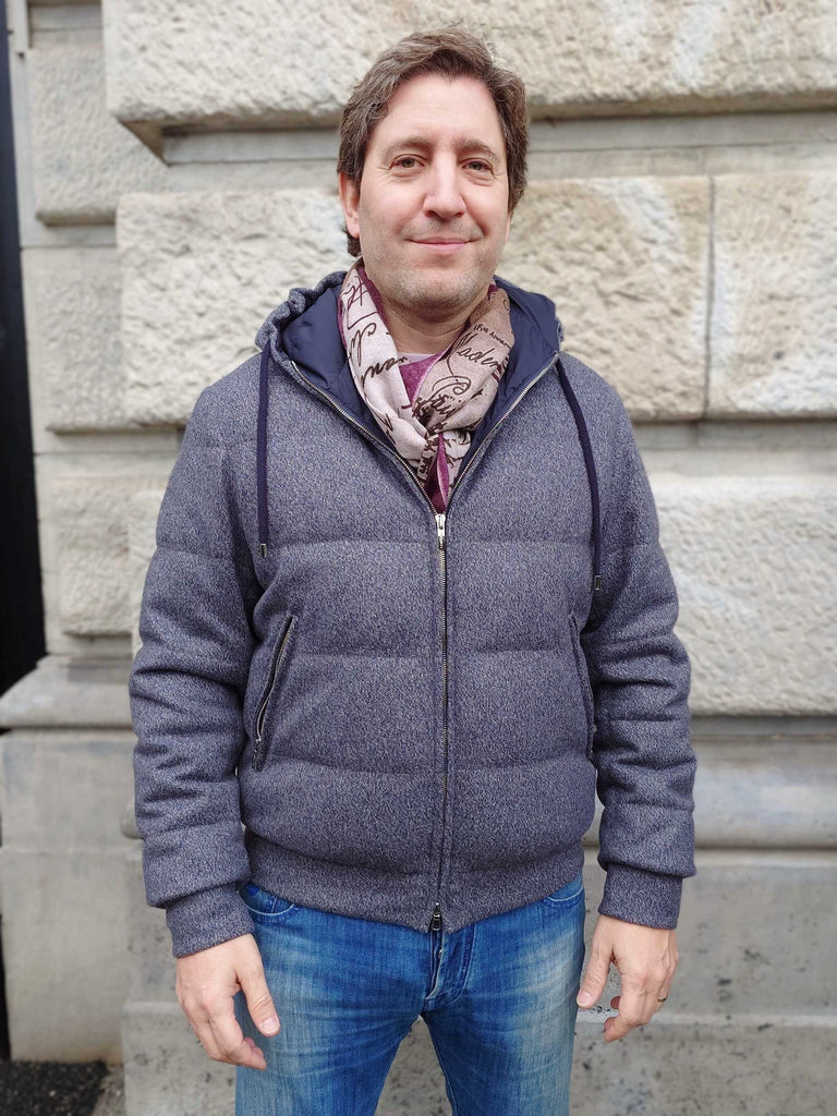 Doudoune en laine et cashmere avec empiècements et finitions en cuir. Un travail artisanal et monté à la main comme un ADN de cette très belle maison italienne.